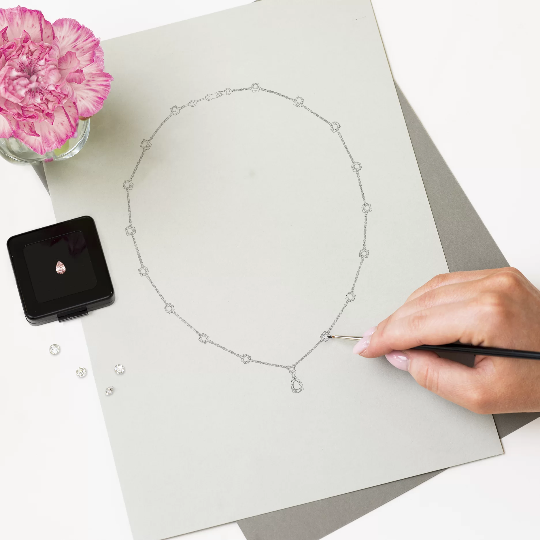 Our jewelry is designed to highlight the natural shape and brilliance of the diamond, while also reflecting its owner. All our jewelry is designed in-house, but we let our customers put their own stamp on it if desired. Our design language is often described as neat and timeless.
