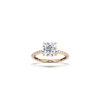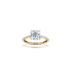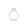 This exquisite ring showcases a sleek, flatter shank adorned with a castle-set diamond band that extends three-quarters of the way down the shank. The design features a stunning cathedral setting, elegantly elevating the center diamond, which is secured by four expertly crafted claws. This combination of details creates a timeless piece that beautifully highlights the brilliance of your chosen diamond.