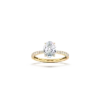 This exquisite engagement ring showcases a sleek, flatter shank adorned with a castle-set diamond band that extends three-quarters of the way down the shank. The design features a stunning setting that creates a soft transaction between the ring shank and the diamond setting. The diamond ring shank gets thinner towards the center diamond, elegantly elevating the center diamond, which is secured by four expertly crafted claws. This combination of details creates a timeless piece that beautifully highlights the brilliance of your chosen oval cut diamond.