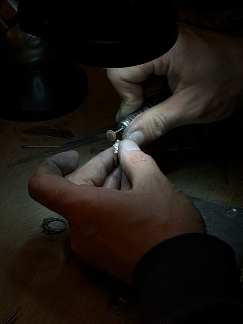 Många väljer en nätt ringprofil som låter formen stå i centrum, eller en lätt avsmalnande skena som förstärker ovalens linjer. Det är en kombination som känns tidlös men samtidigt tydligt i tiden, särskilt för den som vill ha en ring som fungerar lika bra till vardags som till fest. Något vi noterat är att fler vill ha en east to west vilket betyder att diamanter ligger åt det andra håller, alltså inte längst fingret utan diamanten ligger på ”tvären”.