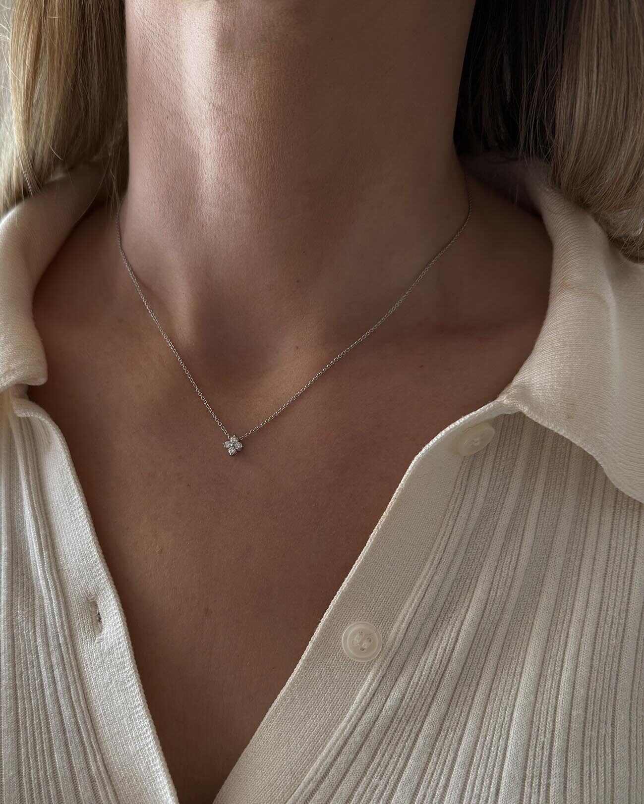 Fyra rundslipade diamanter pryder detta klassiska diamanthalsband ur vår kollektion ’Luck’, inspirerad av fyrklöverns form och dess tidlösa symbolik för tur. Varje diamant är kloinfattad i 18 karat gulguld för att maximera ljusinsläppet och framhäva stenarnas naturliga briljans. Gulguldet gör att diamanterna får ett varmare glitter. Tillsammans representerar de en modern tolkning av tur, hopp och harmoni. Diamanterna är 0.06 carat styck och kedjan är 41 cm lång och har en nätt, klassisk design som låter diamanterna stå i centrum.